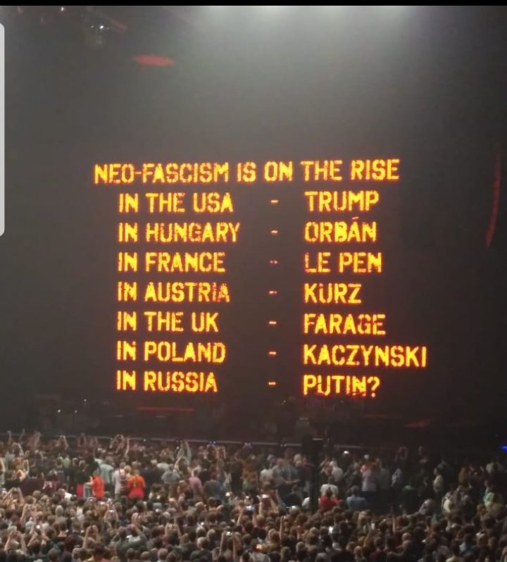 Δεδομένης της εκπεφρασμένης του αντίθεσης προκαλεί ερωτηματικά το ερωτηματικό δίπλα στο όνομα του Ρώσου προέδρου σε γιγαντοοθόνη στη διάρκεια της χθεσινής συναυλίας, ως καταγγελία για την άνοδο του νεοφασισμού διεθνώς, πλάι σε ονόματα όπως του Τραμπ, της Λεπέν και του Ορμπάν. Εκτός κι αν το ερωτηματικό αφορά την ίδια τη δαιμονοποίηση του Πούτιν, εν είδει αμφισβήτησης του αφηγήματος που τον εξισώνει με τις υπόλοιπες κυβερνήσεις της λίστας, πέρα από την όποια σκληρότατη κριτική μπορεί να της ασκηθεί κατά τα άλλα.