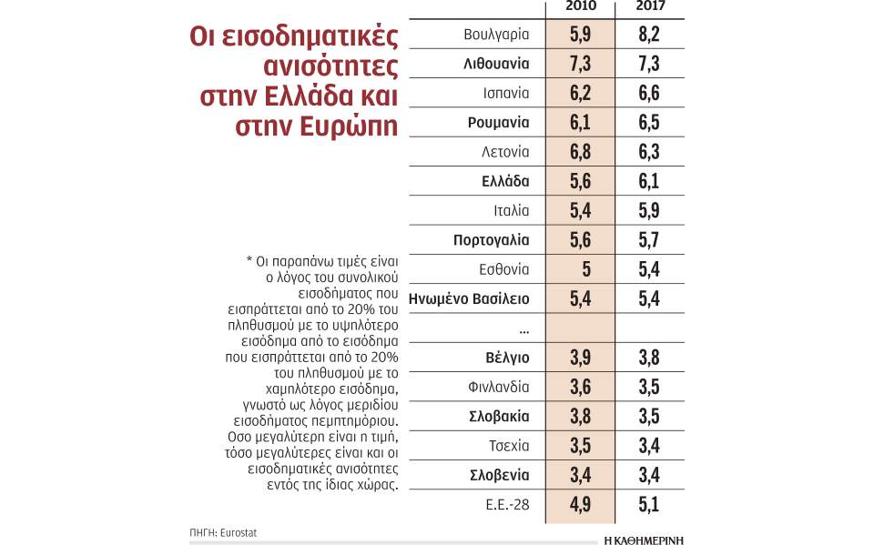 Το 2017, η τιμή που πήρε ο σχετικός λόγος εισοδήματος των πολύ πλουσίων προς το εισόδημα των πολύ φτωχών σε επίπεδο Ευρωπαϊκής Ενωσης ήταν 5,1, ενώ το 2010, στις αρχές της ύφεσης, είχε διαμορφωθεί σε 4,9.