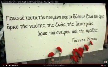 Η ξεχωριστή συναυλία της ΚΝΕ ολοκληρώθηκε με τον ποιητή μας Γιάννη Ρίτσο να απαγγέλλει στίχους από τη «Ρωμιοσύνη», στον πρώτο εορτασμό του Πολυτεχνείου, με πλάνα της εποχής... «Τούτο το χώμα είναι δικό τους και δικό μας. Δεν μπορεί κανείς να μας το πάρει...».